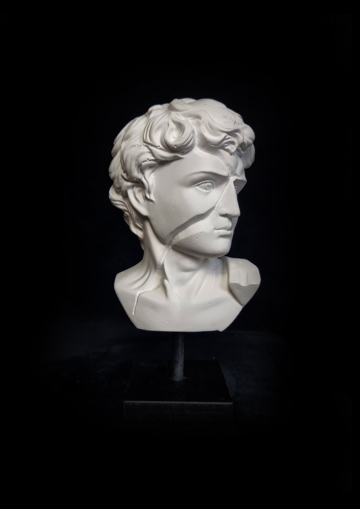 Des visages fissurés laissant apparaître des faisceaux pailletés, des torses en torsion sur lesquels se dessinent des tatouages comme des marques de vies, des bustes sur lesquels les fleurs du mal surgissent ou bien encore une cage thoracique et un cœur qui scintillent, et un fuck qui dit merde aux emmerdes… dans un blanc pur ou dans des couleurs pêchues, ces statues veulent mettre en beauté les maux du quotidien.